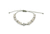 Pulsera ajustable de cruz con circonias, perlas cultivadas y rondeles de brillos plateados. Su diseño ajustable con hilo resistente permite un calce cómodo y seguro, ideal para todo tipo de muñeca.