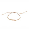 Pulsera de hilo ajustable con tres zirconias, bolita dorada mini y chaquira miyuki en rosa pastel.