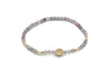 Pulsera de San Benito elástica elaborada con piedras naturales de amatista facetada, que simbolizan la paz interior y la protección, intercaladas con bolitas doradas y perlitas que aportan un toque de elegancia.
