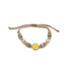Pulsera de hilo beige con piedras facetadas tipo puka y medalla de tambor dorado con Virgen de Guadalupe.
