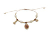 Pulsera ajustable con perlas, bolitas de chapa de oro de 18k, pompón y medalla de Virgen Desatadora de Nudos.