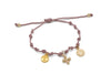 Pulsera ajustable con tres dijes dorados: una cruz, una medalla de la Virgen Milagrosa y una medalla de San Benito de chapa de oro de 18k. Su diseño ajustable la hace ideal para cualquier muñeca, aportando un toque bohemio y elegante a tu look diario.