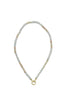 Un collar artesanal que combina cristales facetados en tonos neutros con delicados detalles dorados. Su broche redondo le da un toque moderno y sofisticado, convirtiéndolo en una pieza versátil y elegante para cualquier ocasión.